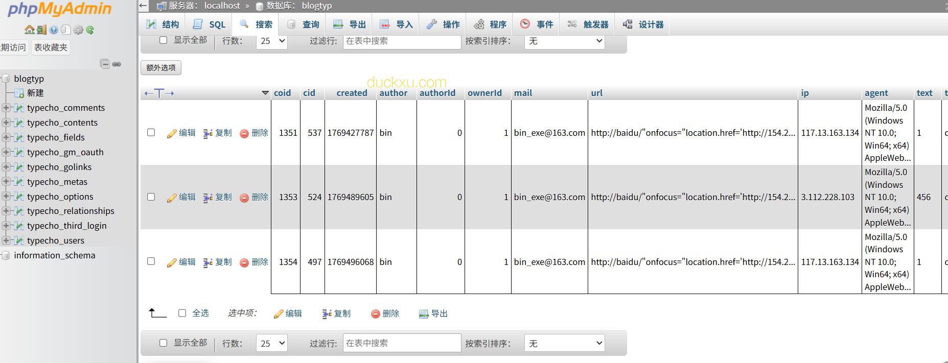 2026-02-04T12:18:15.png直接在MySQL里搜索这个IP地址,找到了。删除他们,正好也看到这人用的是“"onfocus="location.href”办法来重定向。现在就把类似的评论全删了。不过我这里先把跳转的链接置空看看。